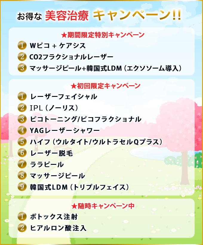当院では保険外の特定の施術メニューについて、キャンペーン価格でご提供させていただいております。ご興味のあるものや体験してみたいメニューがある場合は、ぜひこの機会を利用してみてください。対象メニューは季節などに合わせて定期的に変更いたします。