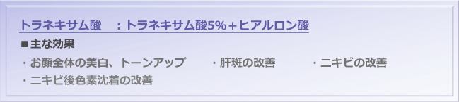 有効成分として、高純度のナイアシンアミド、トラネキサム酸、ビタミンEが配合された製剤です。いずれも美白、メラニン抑制作用があり、お顔のしみ、くすみ、炎症後の色素沈着、 肝斑の改善効果があります。お顔だけでなく、首回り、デコルテ、手の甲にも使用できます。