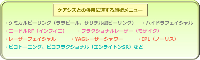 - ケアシスは単独の施術でも効果的ではありますが、ケアシスを含む薬剤導入系の施術は他の施術後に併用して行うと効果がさらにアップするというメリットがあります。