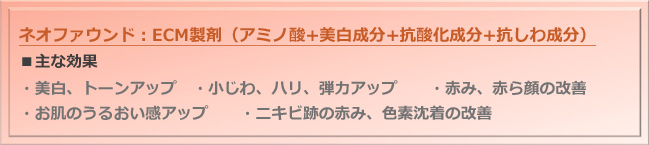 抗酸化成分、美白成分、抗しわ成分、アミノ酸などの多種類の若返り効果のある有効成分がミックスされたECM製剤で、「ネオ注射」と呼ばれている製剤です。