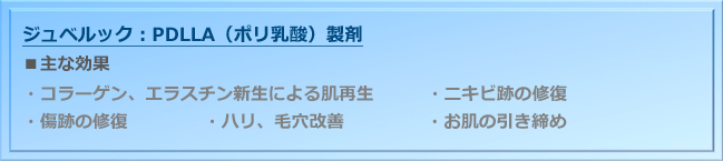 ジュベルックはバイオプラスチックとして工業的にも重要な物質であるPDLLA(ポリDL乳酸)の製剤で、傷跡やニキビ跡を盛り上げる効果に優れています。