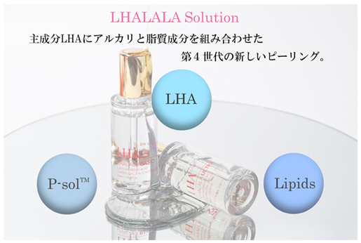 「ララピール」で使用する薬液(ソリューション)の特徴は、主成分のLHA(リポヒドロキシ 酸)に強アルカリ性の P-sol™とリン脂質(Lipids)が組み合わされていることです。