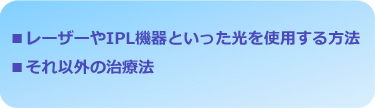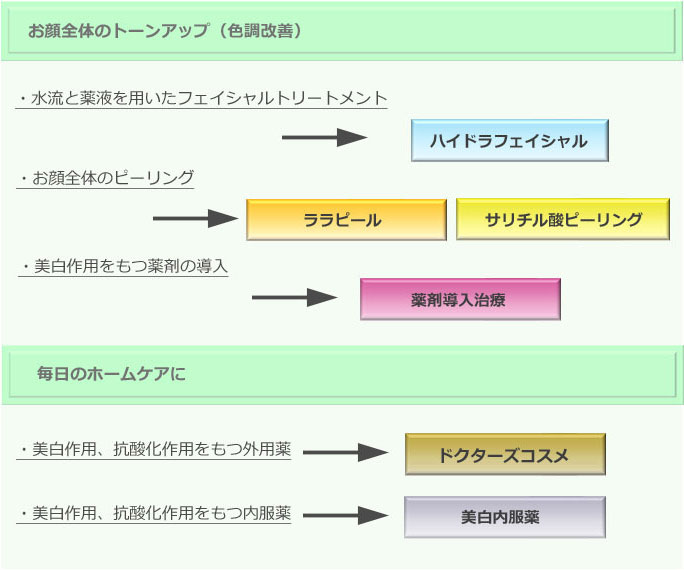 光を使うレーザー治療以外の方法としては、お顔全体のトーンアップを目的とした施術や、外用剤などの毎日のホームケアに適するものが含まれます。