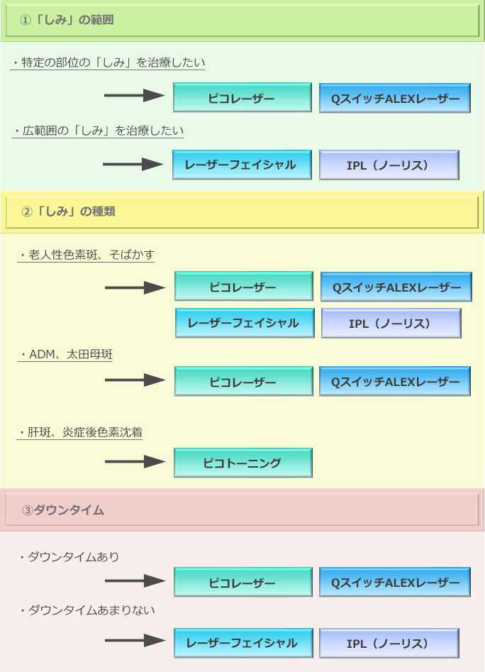 それぞれの“しみ”には、いくつかの治療法がある場合や、施術によってはやっても効果がないもの、中には余計に悪くなってしまうものもあります。