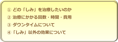 「しみ」の治療をどのようにしていくか決めるうえで、重要なポイントを4つあげてみました。