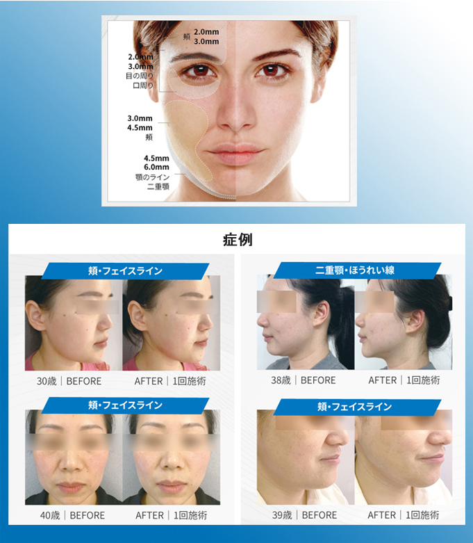 ウルタイトは4つの異なる焦点深度(6.0mm、4.5mm、3.0mm、2.0mm)に照射が可能で、従来の真皮~筋膜層だけでなく、顎下などでは6.0mmを用いた脂肪層へのアプローチも可能となっています。