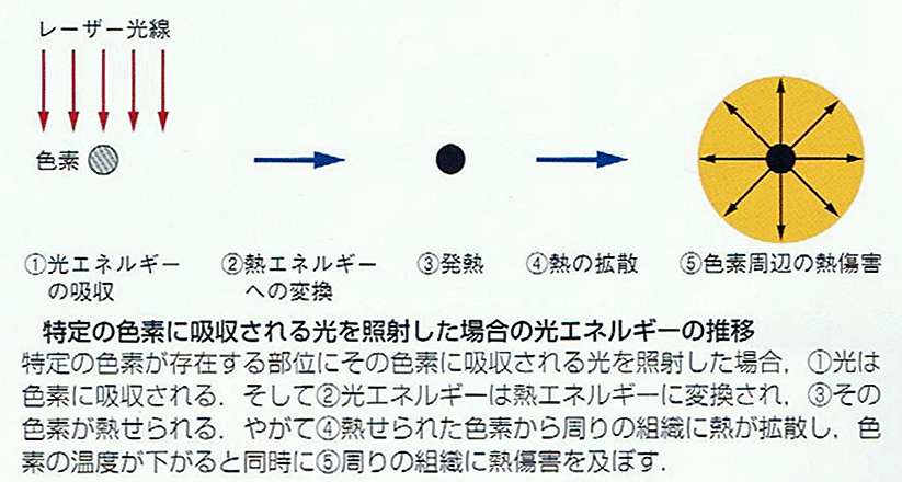 ある物質に対してその色に吸収される波長をもった光を照射すると、そのエネルギーは光熱作用により大部分が熱エネルギーに変換され、吸収した物質の温度が上昇し、その後時間とともに熱の拡散が起こり、周囲の組織と熱の平衡状態となり、この際にその物質や周囲の組織に熱傷害を与えます。