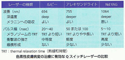 現在、色素性病変専用に販売されているQスイッチレーザーは3種類あり、以下のようなパラメーターをもっています。