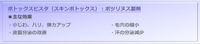 ボツリヌス製剤を皮膚の浅い部位である真皮~皮下脂肪層の多数の箇所に少量ずつ注射します。表情筋にマイルドに筋弛緩作用が生じることにより、表情による小じわを改善させる効果もありますが、それ以外にお顔表面の肌質改善効果(ハリ、つや、引き締め)や、毛穴の収縮、汗腺や脂腺を抑制する作用も確認されています。