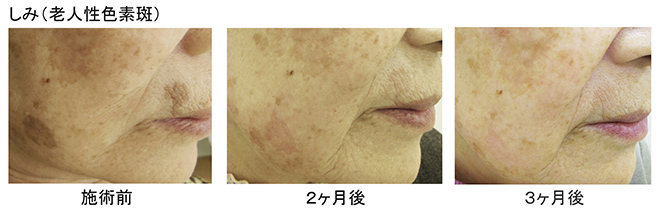 顔面に大型のしみ(老人性色素斑)が散在しております。Qスイッチレーザーにより、2カ月後にはわずかな赤みは残っておりますが、シミの原因であるメラニン顆粒はほぼ脱落しています。