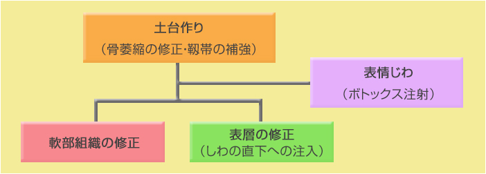 顔面の老化の原因の中でも、特に顔面骨格の退縮によるボリュームロスや、顔面骨格と皮膚組織をつなぎとめる靱帯を補強するために、まずは土台作りのためにヒアルロン酸製剤の注入を行います。